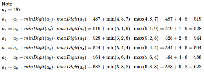 | 4 | a4 = a3 + min(a3) * max(a3) = 6 + min(6) * max(6) = 6 + 6 * 6 |