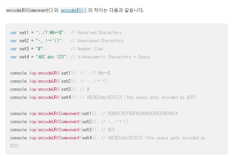 대표적으로 encodeURI()와 encodeURIComponent() 함수가 제공되는데