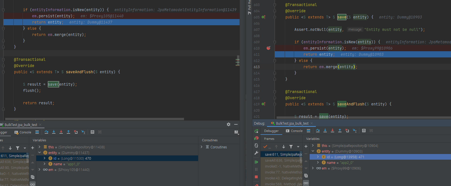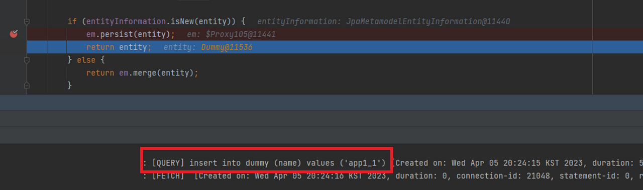 간단하게 동일한 앱 두 개를 띄우고 em.persist에 BreakPoint를 건 후 entity에 PK가 어떻게 입력되는지 확인해보려 합니다.