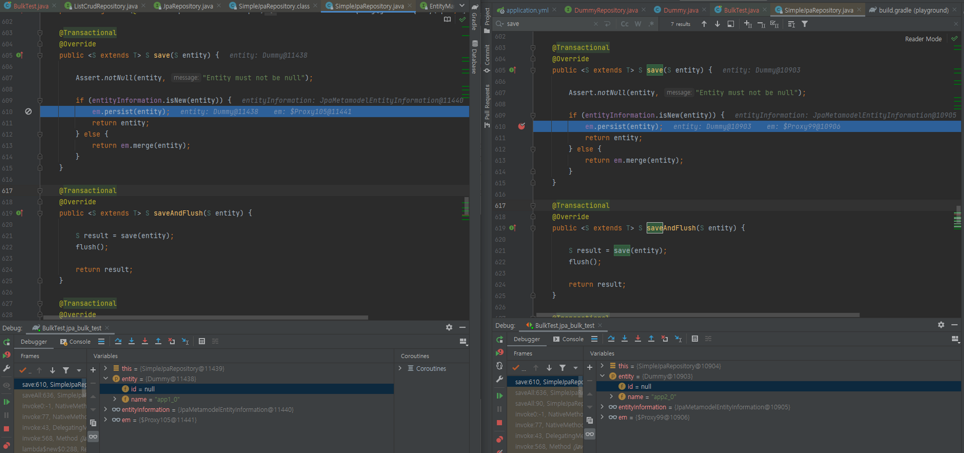 위 사진처럼 saveAll을 할 때 Bulk로 처리되지 않는 것을 확인했습니다.