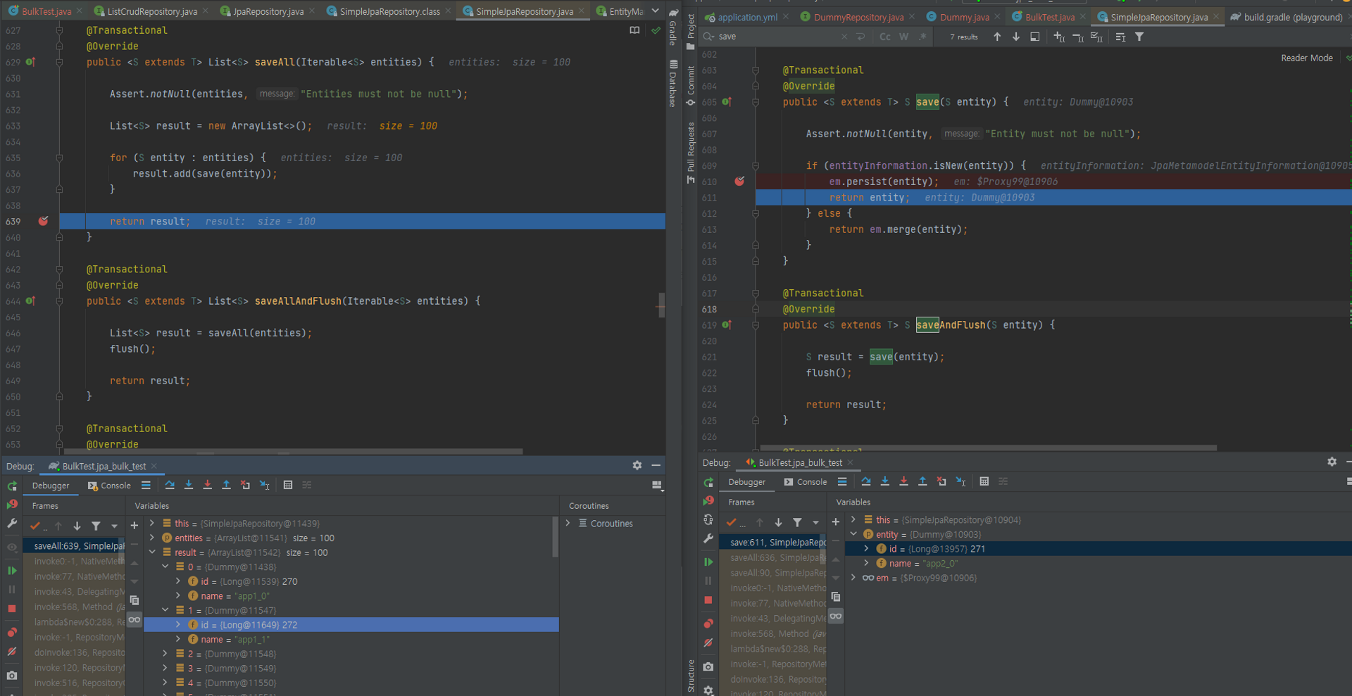 결국, 한 트랜잭션 안에서 반복문을 돌며 100개의 save를 호출하던, 100개의 Entity List를 saveAll로 1회 호출하던 결과는 같다는 것을 알 수 있습니다.