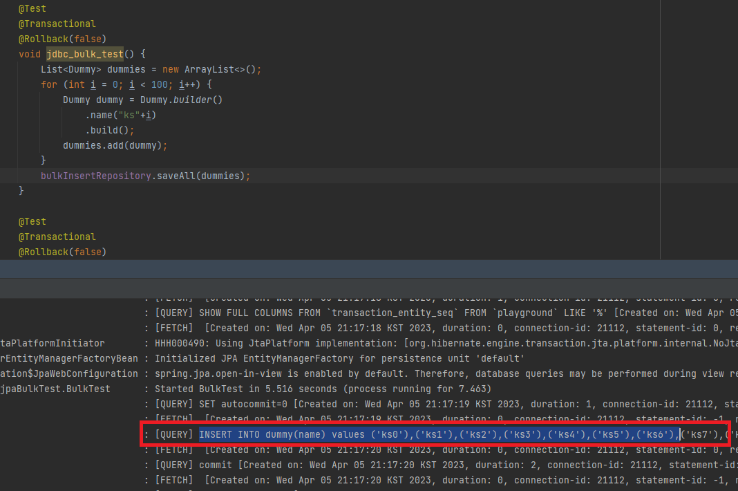 해당 메서드를 실행하면 아래와 같이 Bulk INSERT가 수행되는 것을 볼 수 있습니다.
