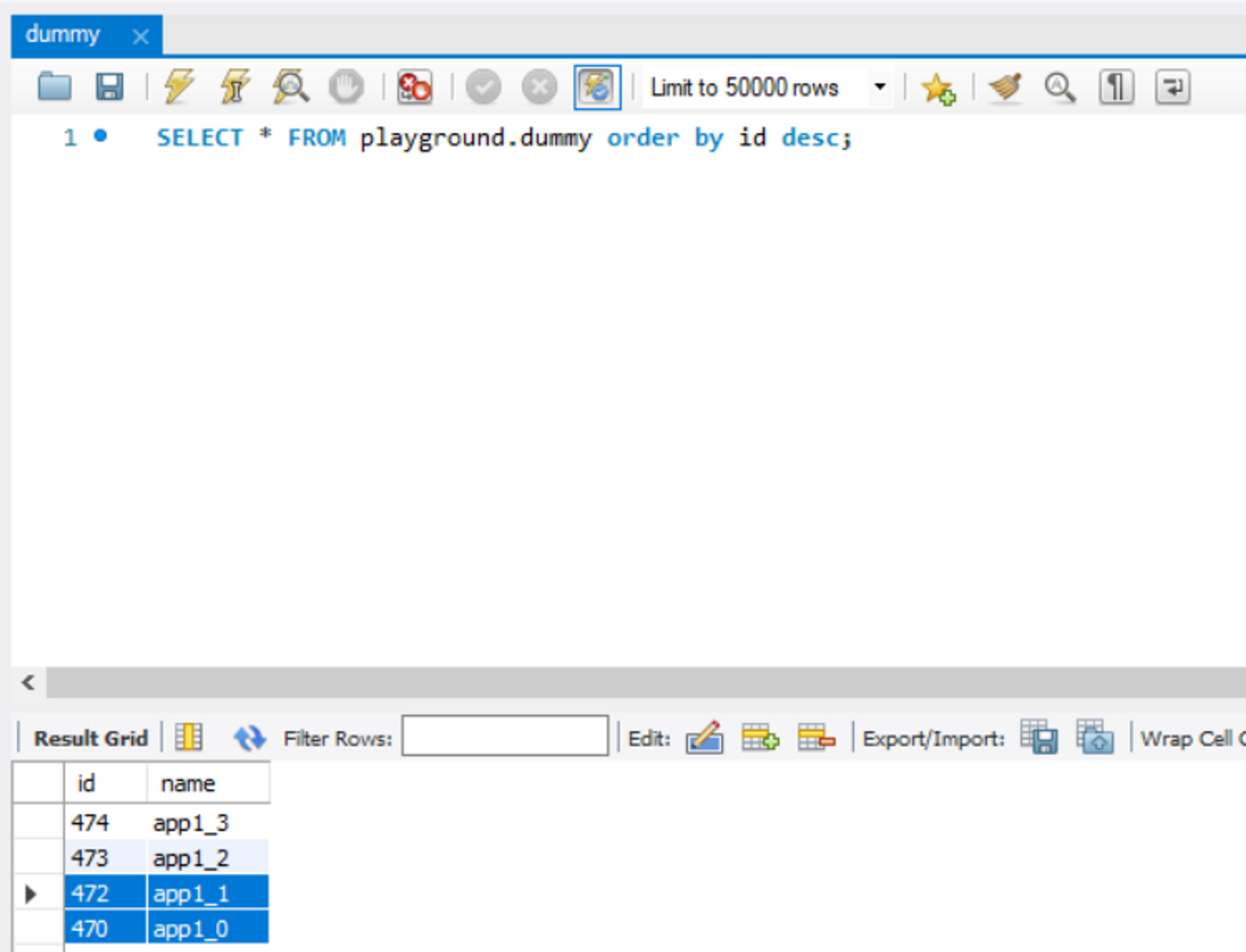 2번 앱이 점유했던 471번 pk를 건너뛴 것을 확인했으며, 이어서 2번 앱의 트랜잭션을 끝냈습니다.