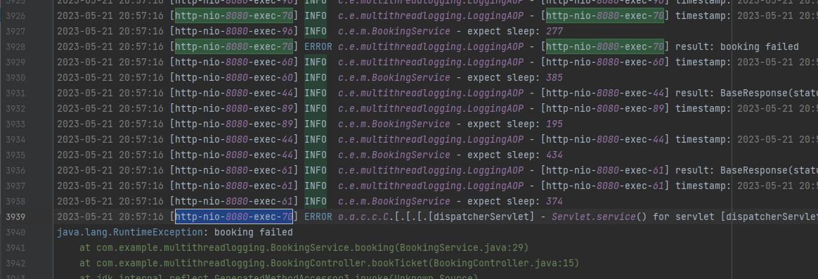 실제 환경에서는 복잡한 비즈니스 로직으로 인해 더 다양한 로그가 기록되고, 분산 환경인 경우 별도 설정이 없다면 스레드 이름까지 겹치게 됩니다.