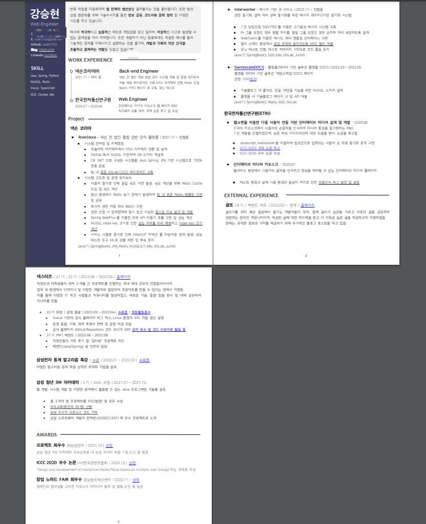 너무 보여주고 싶은 내용이 많았기 때문인데요, 각 대외활동을 너무 자세하게 적었고 하드 스킬(언어나 프레임워크) 외 소프트 스킬(커뮤니케이션, 업무 태도 등)까지 자세히 적었습니다.