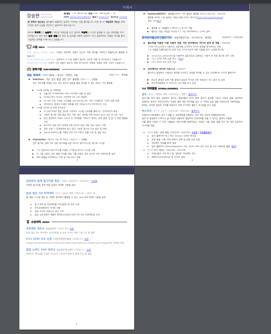 포트폴리오를 따로 작성하지 않던 시절이라, 이력서가 무려 7페이지에 달했습니다.