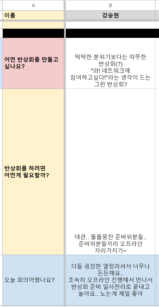 앞에 3명은 운영진이라 몇몇 질문의 내용 기재를 생략했지만 준비위원회(이하 준비위) 분들은 정말 꼼꼼하게 내용을 작성해주셨답니다.
