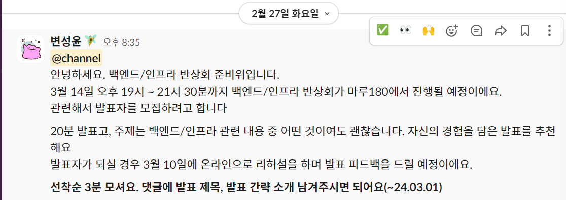 심지어 그 때 당시엔 개발자+디자이너 합한 인원이었지만, 이번 반상회에서는 백엔드&인프라 직군의 비중이 많은 것을 감안하면 너무나 심장이 뛰는 상황이었죠.