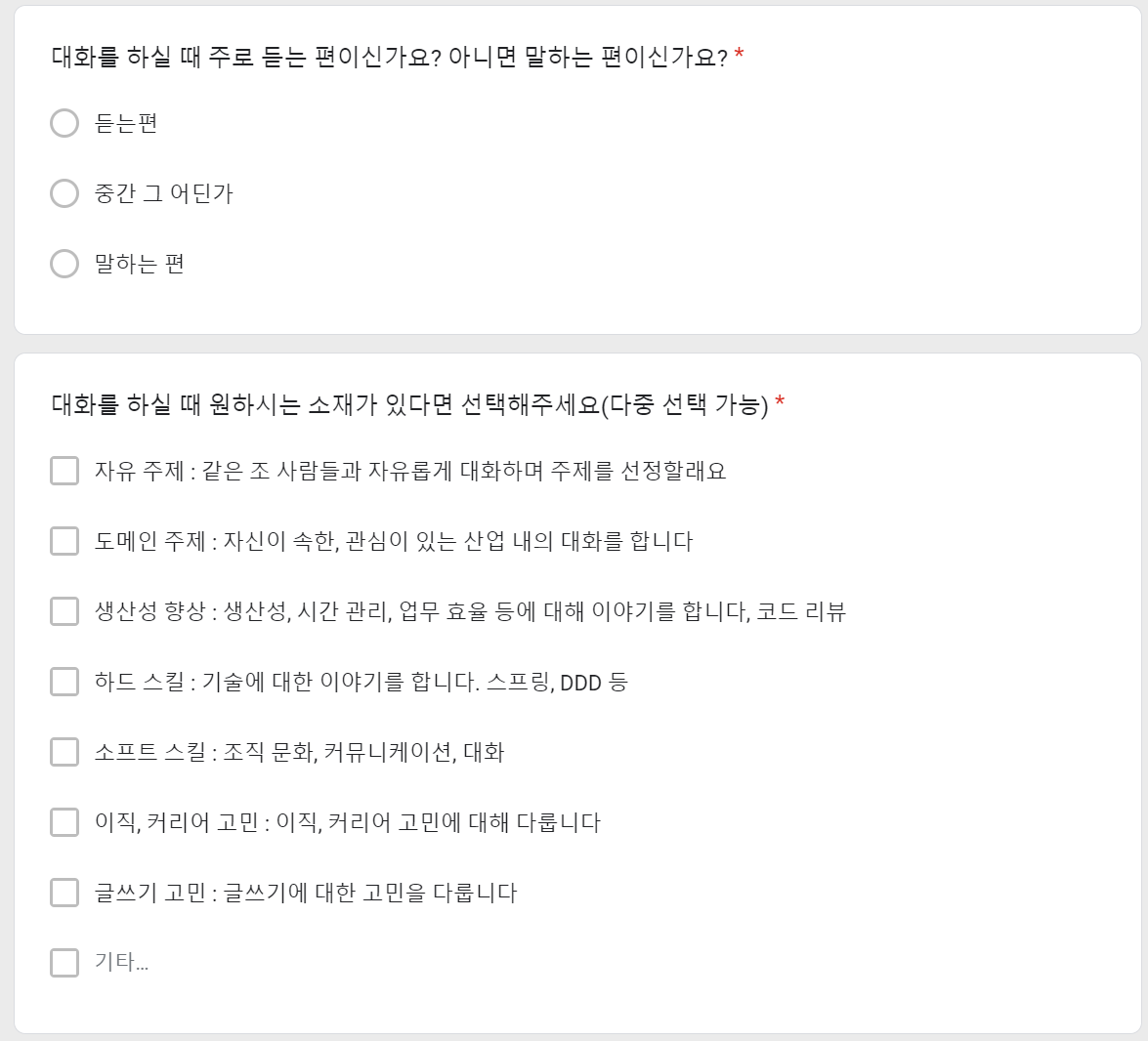 사전에 참여신청 할 때 원활한 조편성을 위해 미리 설문을 준비했어요.