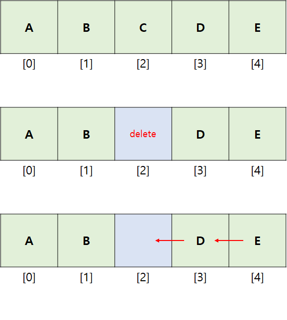가운데 C를 제거한다고 가정하면 연속적인 배열이기 때문에 한칸씩 다시 당겨야하는 상황이 벌어집니다.