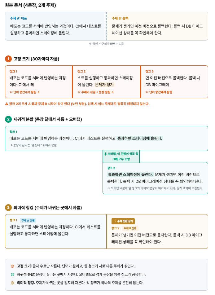 둘째, 문서 전체를 하나의 벡터로 압축하면 특정 주제의 신호가 희석된다. "시스템 배포 절차"와 "장애 대응 매뉴얼"이 섞인 긴 문서를 하나의 벡터로 만들면, "배포 오류 처리" 같은 쿼리에 이 벡터가 적절히 응답하지 못한다.