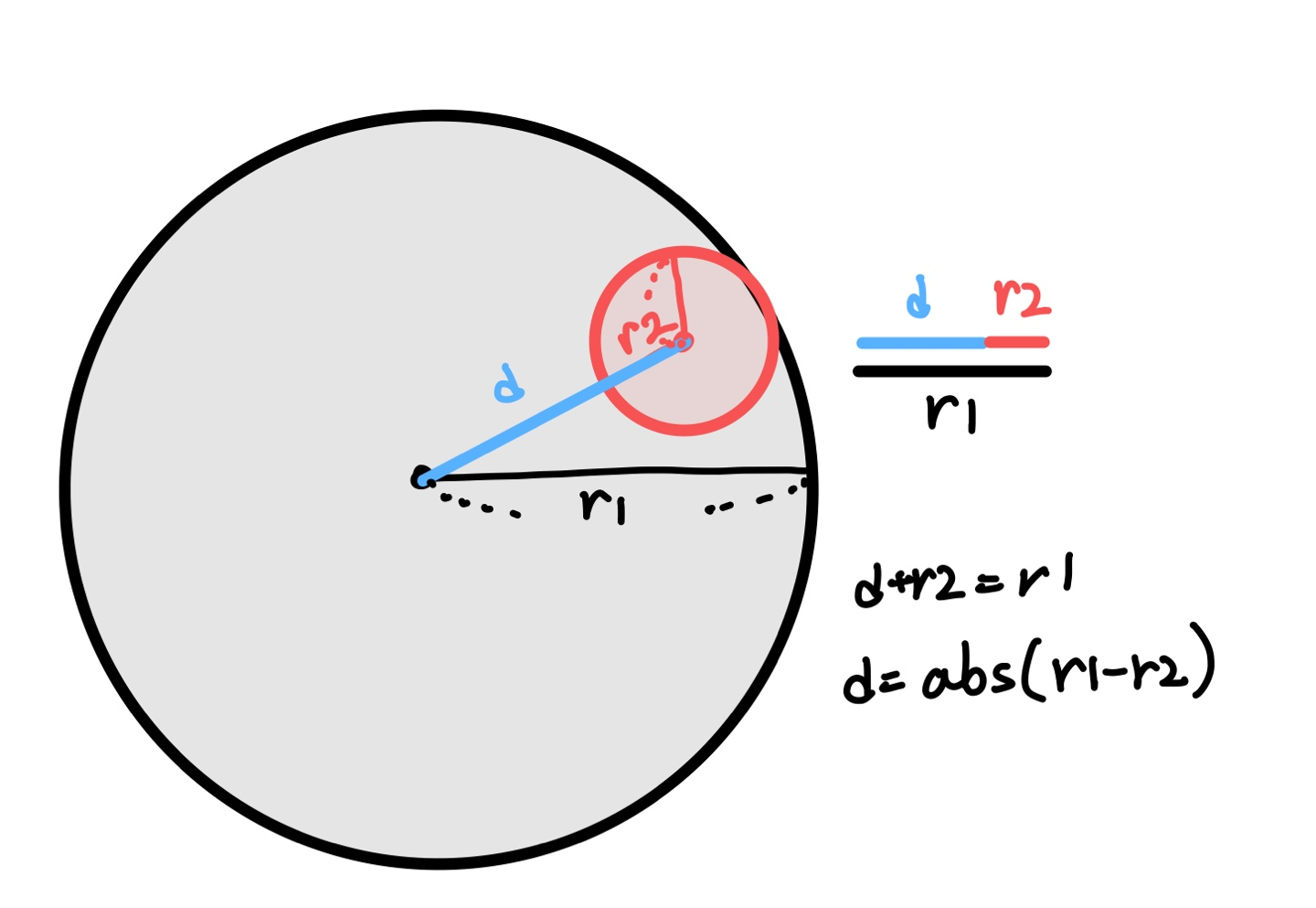 (내접) 두 원의 거리 == 원1 반지름 + 원2 반지름