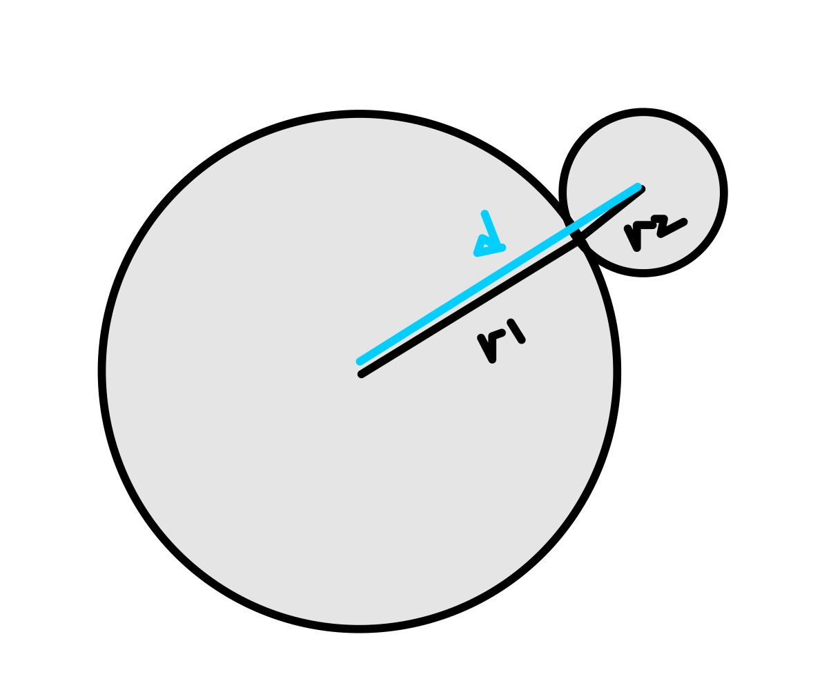 (내접) 두 원의 거리 == 원1 반지름 + 원2 반지름