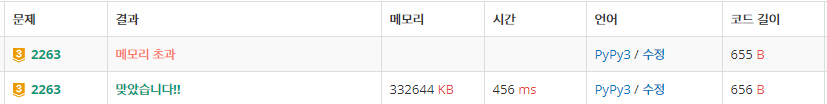 아이러니하죠. sys.stdout.write가 속도는 분명 더 빠릅니다. 하지만 시간초과가 아닌 메모리 초과를 받을 줄은 상상도 못했습니다.