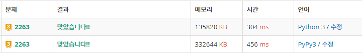시간상으론 분명 빠른 것을 볼 수 있습니다. 하지만 시간뿐만 아니라 메모리 관리도 신경을 써야 하는데요. pypy3는 가비지 컬렉터가 python3와 다른 구조기 때문에 python3보다 더 많은 메모리로 사용된다고 합니다.(출처)