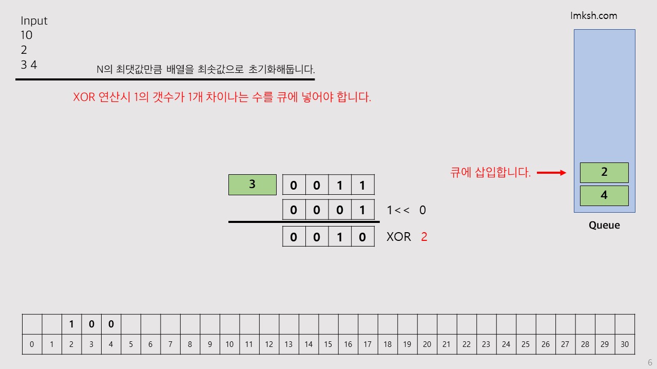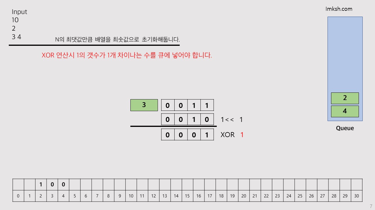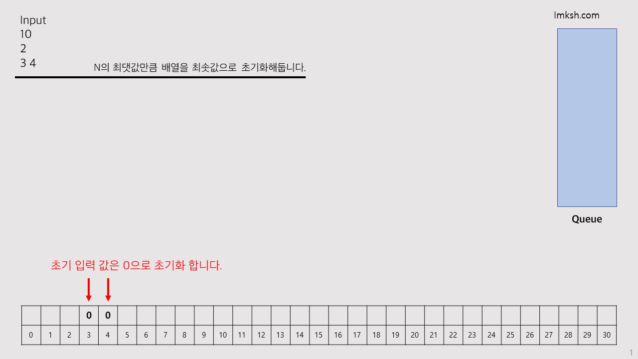 아래의 과정(BFS)을 반복적으로 거치고 나면 가장 처음에 입력된 값을 기준으로 1의 거리를 가진 간선들이 연결되어 있습니다.