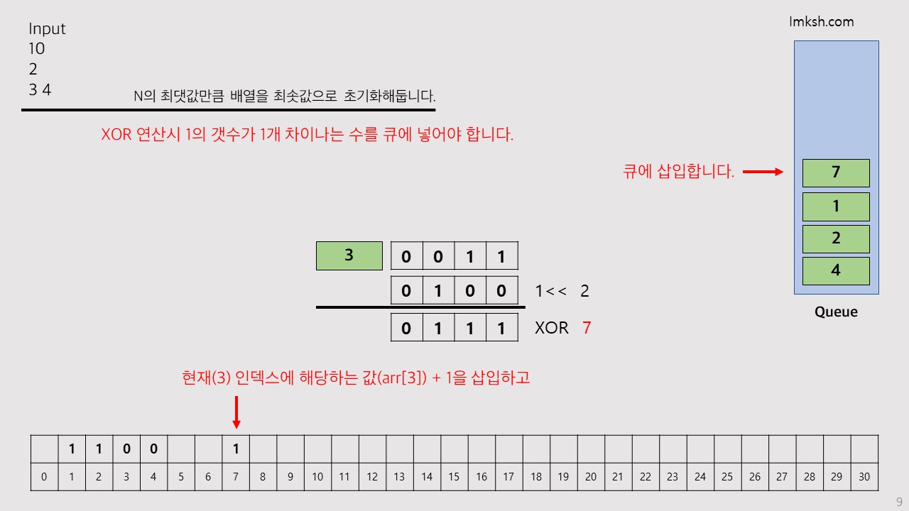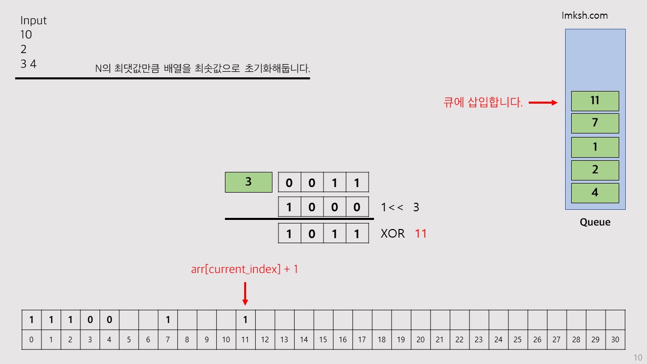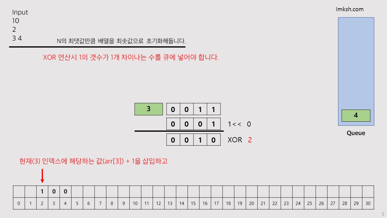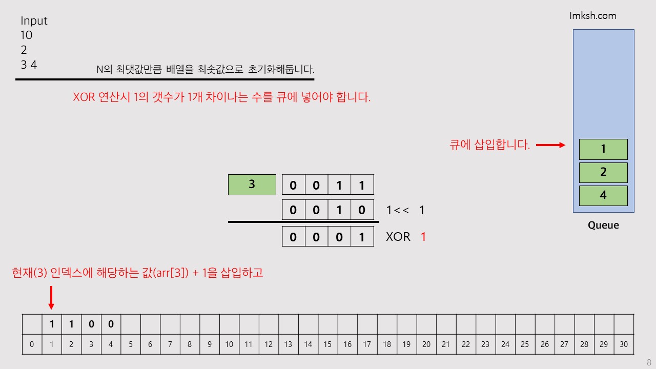 아래의 과정(BFS)을 반복적으로 거치고 나면 가장 처음에 입력된 값을 기준으로 1의 거리를 가진 간선들이 연결되어 있습니다.