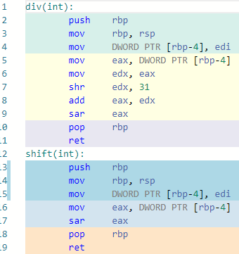 코드는 위의 소스코드를 사용했으며, 나누기 연산을 호출할 때와 시프트를 호출할 때 디스어셈블러로 살펴보았습니다.