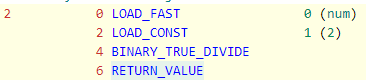 차이점은 BINARY_TRUE_DIVIDE와 BINARY_RSHIFT를 호출 하는 것입니다.