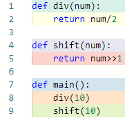 Python3와 마찬가지로 나누기와 시프트 연산의 내부 구조가 다른 것을 볼 수 있습니다.