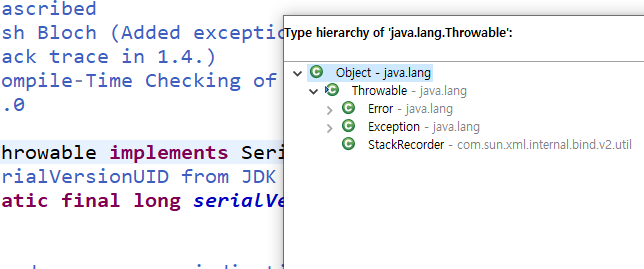 Exception을 계속 타고 올라가다보면 최상위에 Throwable이 있습니다.
