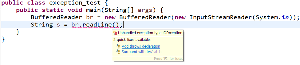 다들 입력을 받으실 때 BufferedReader를 사용하실 겁니다. 이 기능을 main에서 쓰면 항상 빨간줄이 그이고 throws IOException을 해줘야만 빨간 줄이 사라지죠. throws를 사용하지 않는다면 try-catch문으로 반드시 처리를 해줘야만 합니다. 따라서 Checked Exception에는 대표적으로 IOException이 있겠습니다.