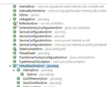 이 에러들이 바로 Error의 하위 자식 클래스입니다. 위 사진에서도 VirtualMachineError의 OutOfMemoryError, StackOverflowError가 정의되어 있는 것을 볼 수 있습니다.