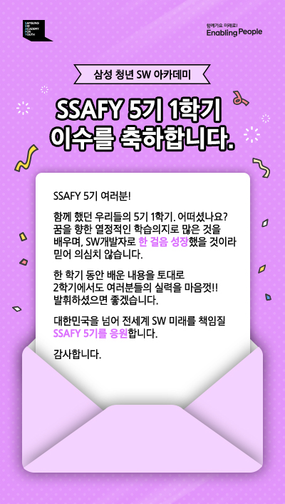 한 학기 동안 SSAFY를 통해서 SW적 역량은 물론이고 정신적으로 많이 성숙할 수 있었습니다.