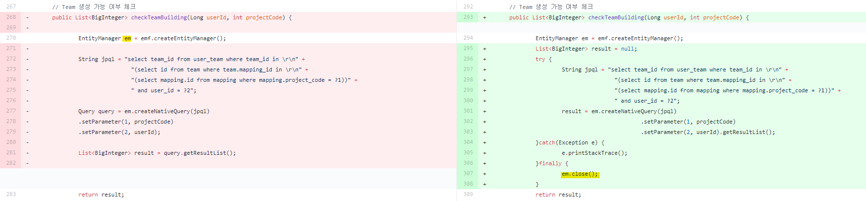 당연히 되어 있을 것이라 생각했던 부분인데, 보고나서 곧장 em.close()와 예외 처리를 해주고 이후에 et.rollback까지 처리하였습니다.