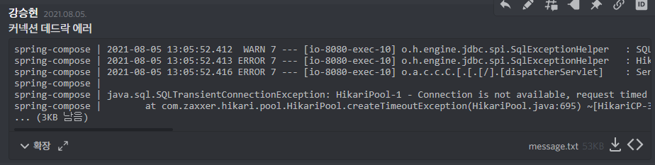 사진에서의 에러 보고는 첫 날이 8월 5일이지만, 저 Dead lock 에러때문에 에러 채널을 따로 생성하고 에러 체크를 하기 시작했습니다.